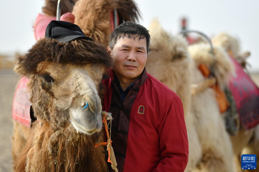曹文華和編號“414”的領(lǐng)頭駱駝合影(4月24日攝)。