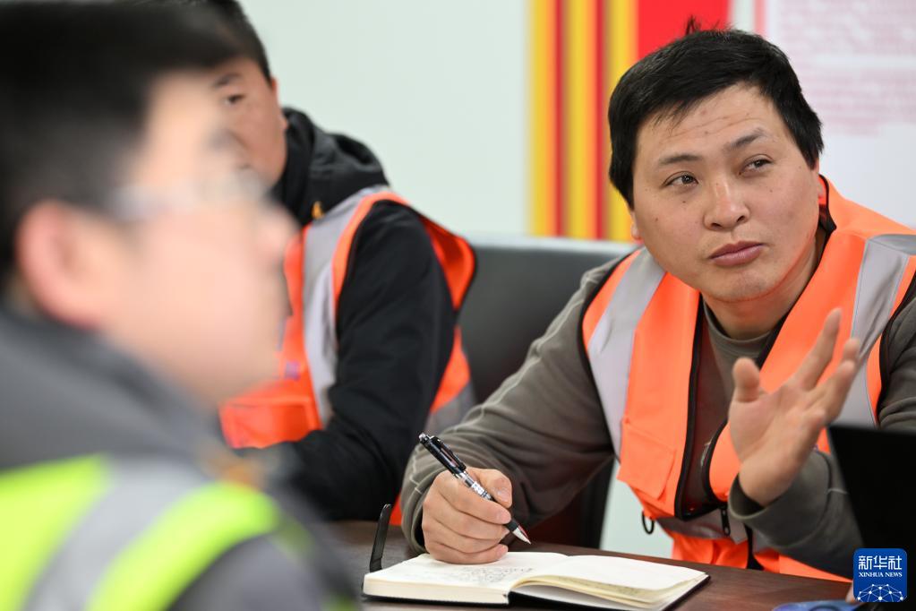 齊國超(右)在項目部參會(huì )討論下一階段施工任務(wù)(4月26日攝)。