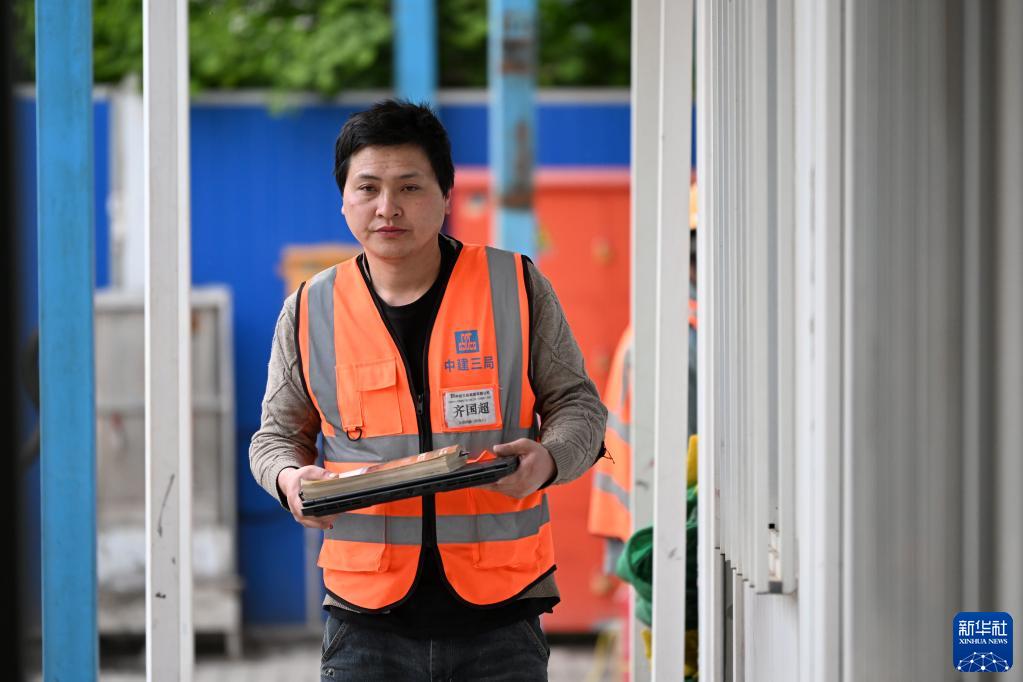 齊國超在工地拿著(zhù)書(shū)和電腦前行(4月29日攝)。