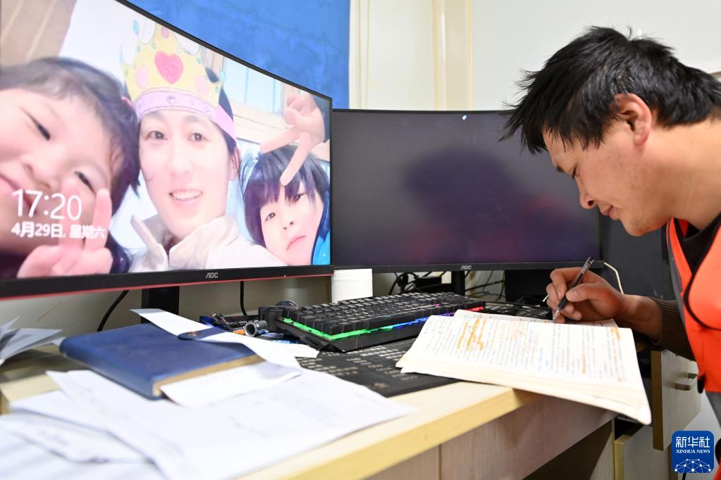 齊國超在電腦前看書(shū),備考一級建造師(4月29日攝)。