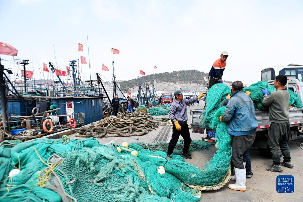 4月30日,在山東青島西海岸新區積米崖漁港,漁民在卸載漁船上的網(wǎng)具。
