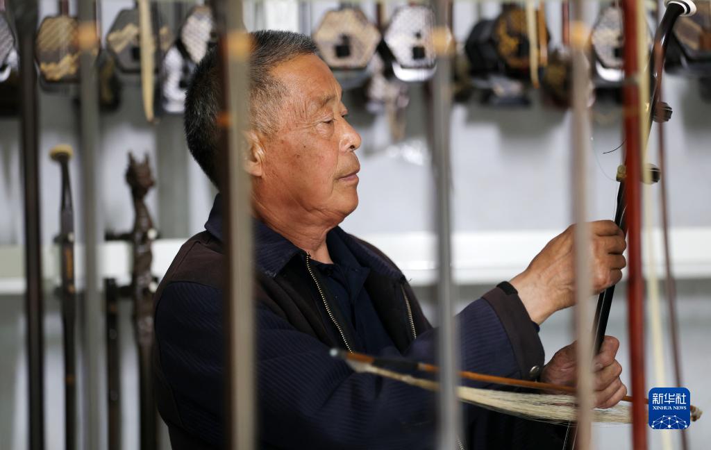 4月20日,高振保在查看制作完成的二胡。