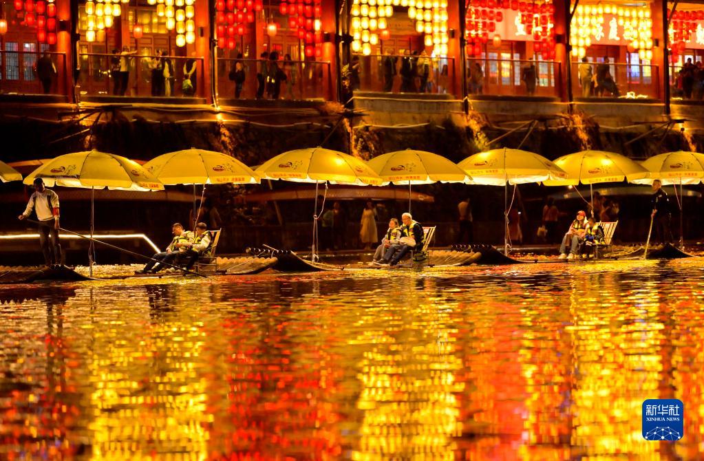 4月30日晚,游客在湖北省宣恩縣城貢水河上體驗“貢水游龍”。