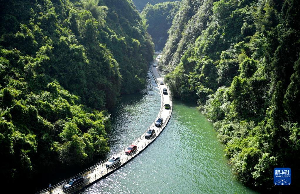 5月1日,游客駕車(chē)在湖北省宣恩縣獅子關(guān)景區水上浮橋上觀(guān)賞景色。