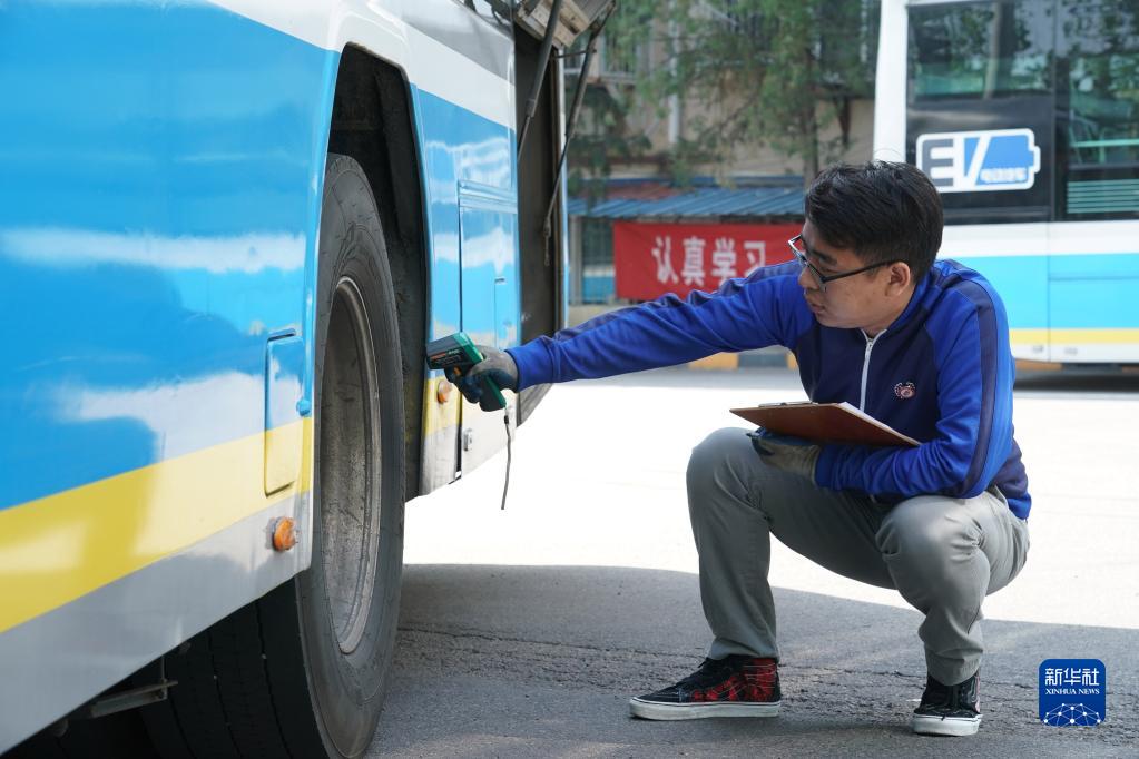 5月1日,在位于北京市朝陽(yáng)區的柳芳公交場(chǎng)站,技術(shù)員王陸斌對車(chē)輪測溫。