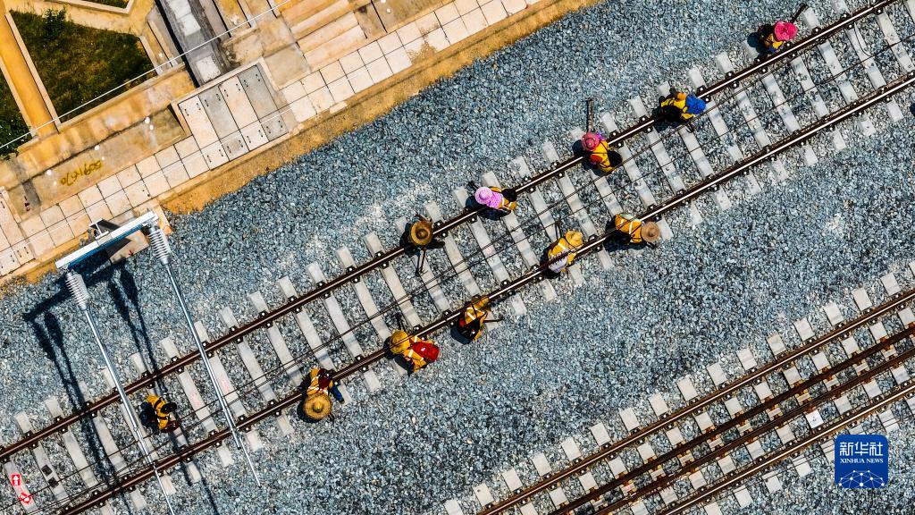 5月1日,中國鐵路南寧局集團有限公司南寧工務(wù)段貴南高鐵軌道精調組的工人在貴南高鐵南寧樞紐有砟路段整理道床(無(wú)人機照片)。