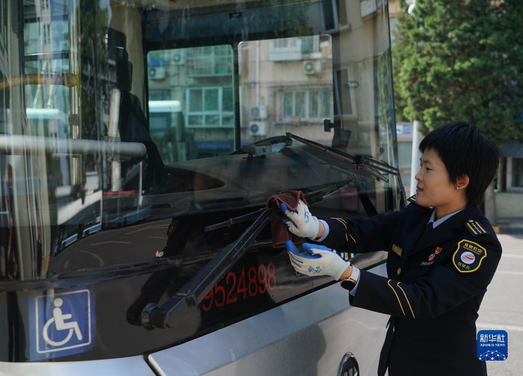 5月1日,在位于北京市朝陽(yáng)區的柳芳公交場(chǎng)站,104路公交車(chē)駕駛員高國然在發(fā)車(chē)前進(jìn)行出車(chē)例檢。