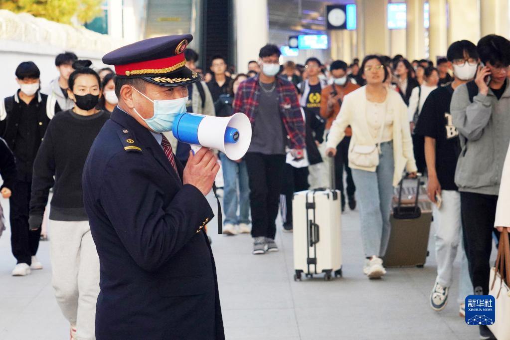 4月29日,淄博火車(chē)站工作人員在引導出站旅客。
