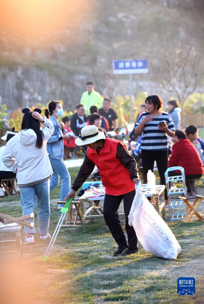 4月30日,在淄博市沂源縣悅莊鎮下龍巷村燒烤廣場(chǎng),一名志愿者在撿拾垃圾。