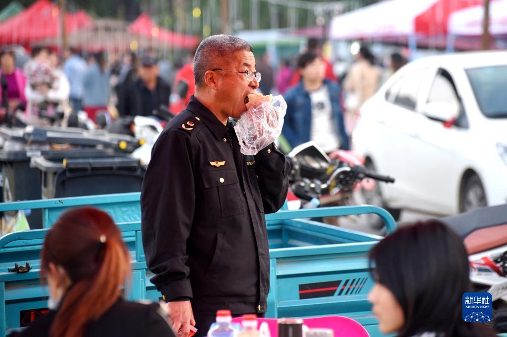 4月30日,在淄博市沂源縣悅莊鎮下龍巷村燒烤廣場(chǎng),鎮市場(chǎng)監督管理所的一名工作人員在值勤現場(chǎng)吃晚餐。