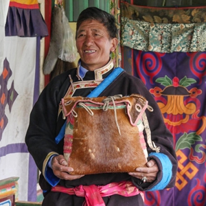 索朗群培展示他制作的工藝品馬包(4月18日攝)。