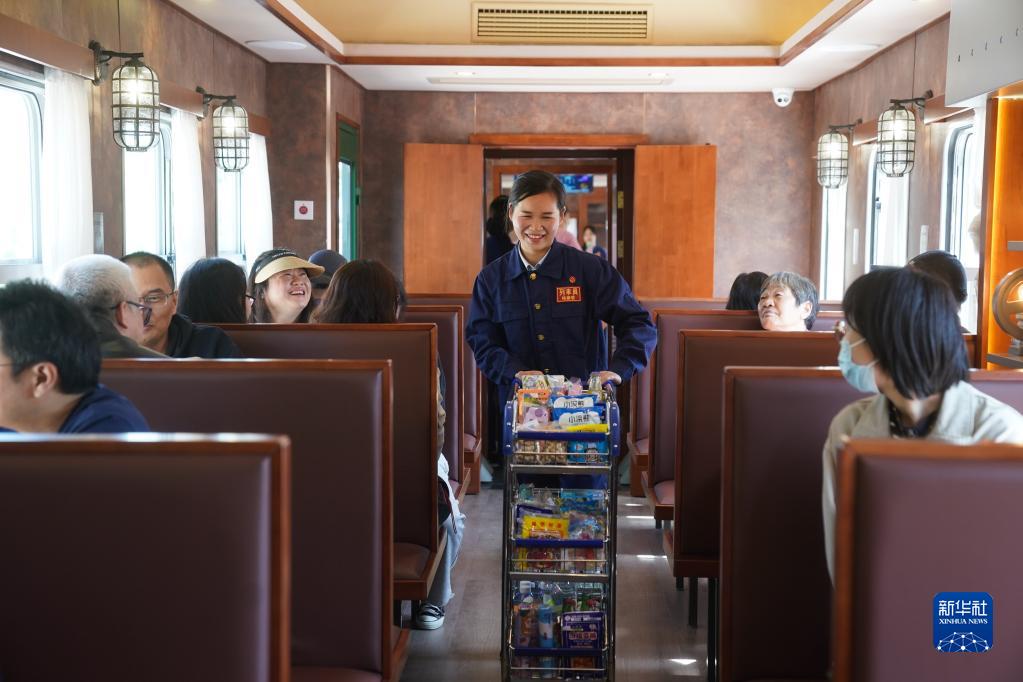 5月1日,工作人員在“梅鋼號”觀(guān)光車(chē)上售賣(mài)商品。