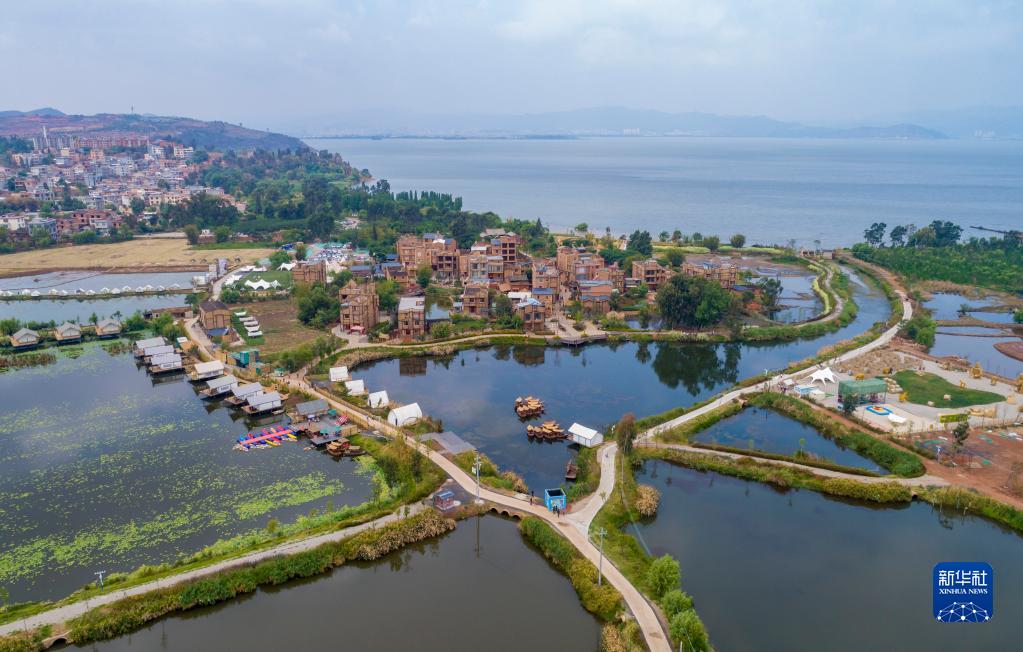 4月30日拍攝的經(jīng)過(guò)提升改造的小漁村。遠處是滇池(無(wú)人機照片)。