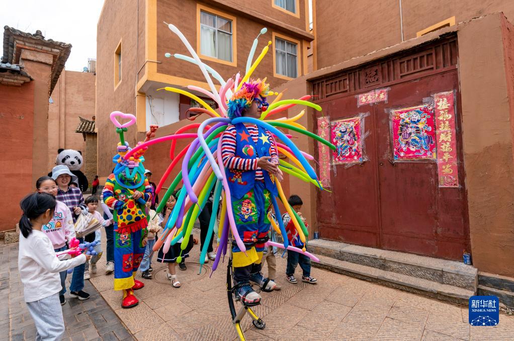 4月30日,由幾名工作人員裝扮的小丑帶領(lǐng)小朋友在小漁村內游玩。