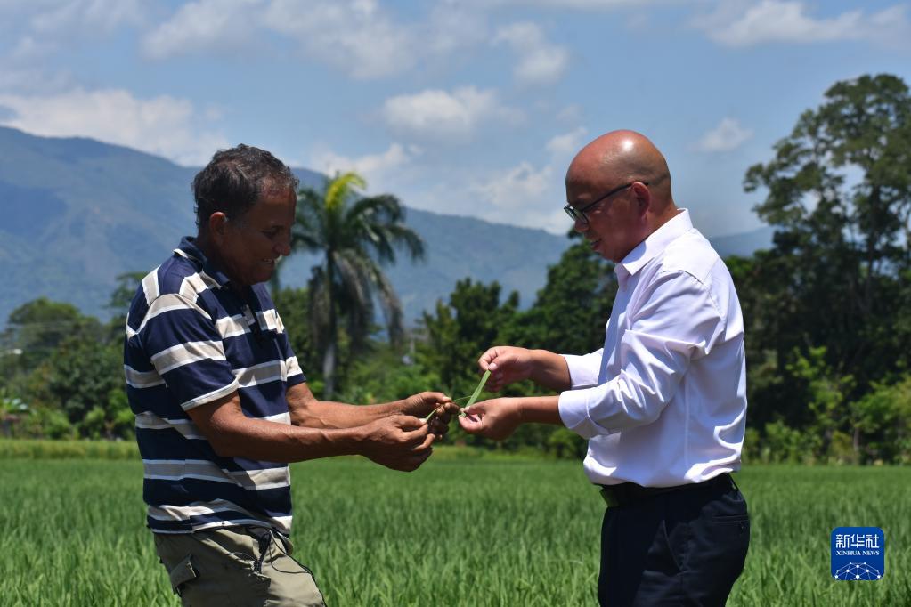 4月26日,在多米尼加首都圣多明各西北約80公里處,中國農業(yè)專(zhuān)家(右)和一名多米尼加水稻專(zhuān)家(左)在多米尼加國家水稻培訓中心的一片試驗田內討論水稻種植問(wèn)題。
