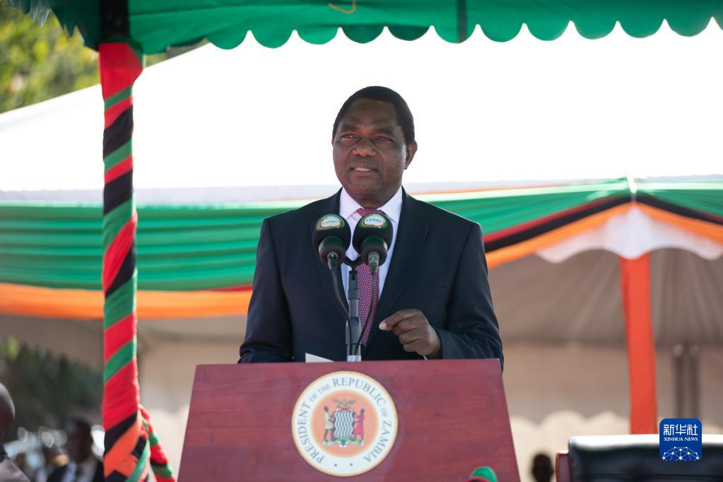 5月1日,在贊比亞首都盧薩卡,贊比亞總統希奇萊馬在“五一”國際勞動(dòng)節游行活動(dòng)上講話(huà)。