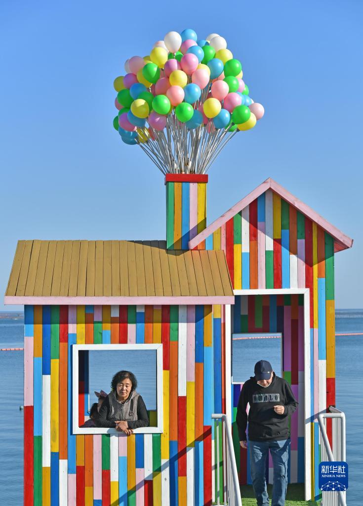 4月30日,在遼寧省大連市塔河灣歡樂(lè )海岸,游客在拍照留影。