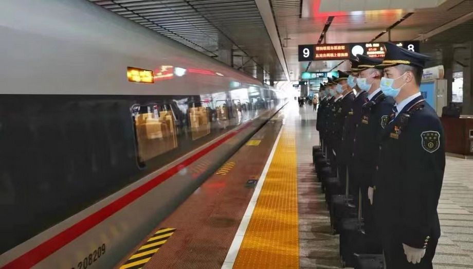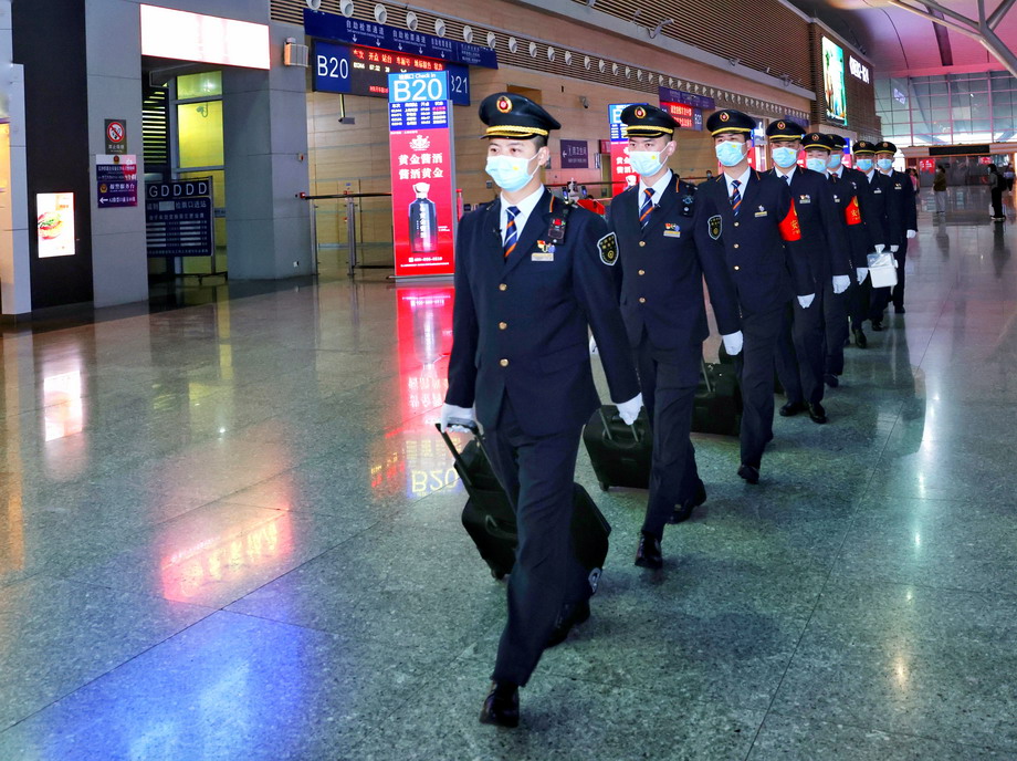 五一假期期間,長(cháng)沙客運段動(dòng)二車(chē)隊G1348次高鐵上“鐵男組”乘組光榮在崗。圖為長(cháng)沙客運段動(dòng)二車(chē)隊G1348次出乘。新華網(wǎng)發(fā)