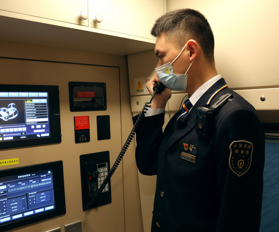 五一假期期間,長(cháng)沙客運段動(dòng)二車(chē)隊G1348次高鐵上“鐵男組”乘組光榮在崗。圖為長(cháng)沙客運段動(dòng)二車(chē)隊黨員列車(chē)長(cháng)劉力賓利用廣播宣傳提示。新華網(wǎng)發(fā)