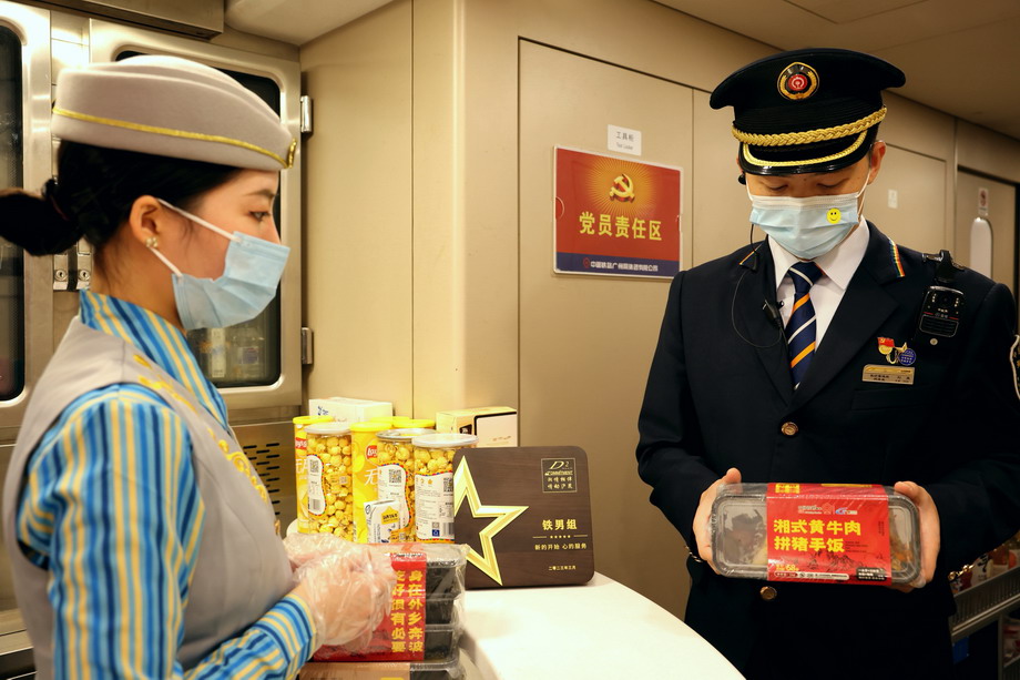 五一假期期間,長(cháng)沙客運段動(dòng)二車(chē)隊G1348次高鐵上“鐵男組”乘組光榮在崗。圖為長(cháng)沙客運段動(dòng)二車(chē)隊黨員列車(chē)長(cháng)劉堅始發(fā)前對食品安全進(jìn)行檢查。新華網(wǎng)發(fā)