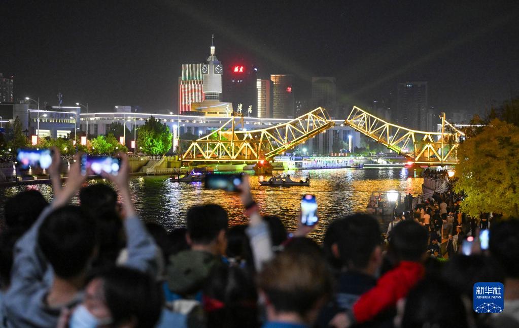 5月1日晚,位于天津海河上的標志性建筑物解放橋橋梁開(kāi)啟,橋梁開(kāi)啟角度達到最大角度60度。