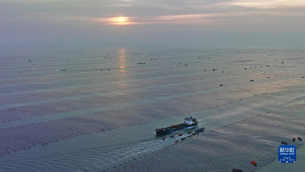 5月2日,在山東省榮成市愛(ài)倫灣海洋牧場(chǎng),收獲海帶的養殖船和運輸鮑魚(yú)的運鮮船在養殖區穿梭(無(wú)人機照片)。