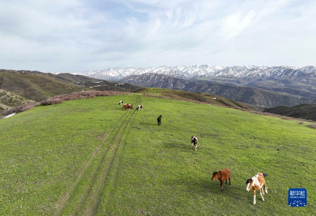 這是4月28日在新疆塔城地區裕民縣拍攝的巴爾魯克山區草原景色(無(wú)人機照片)。