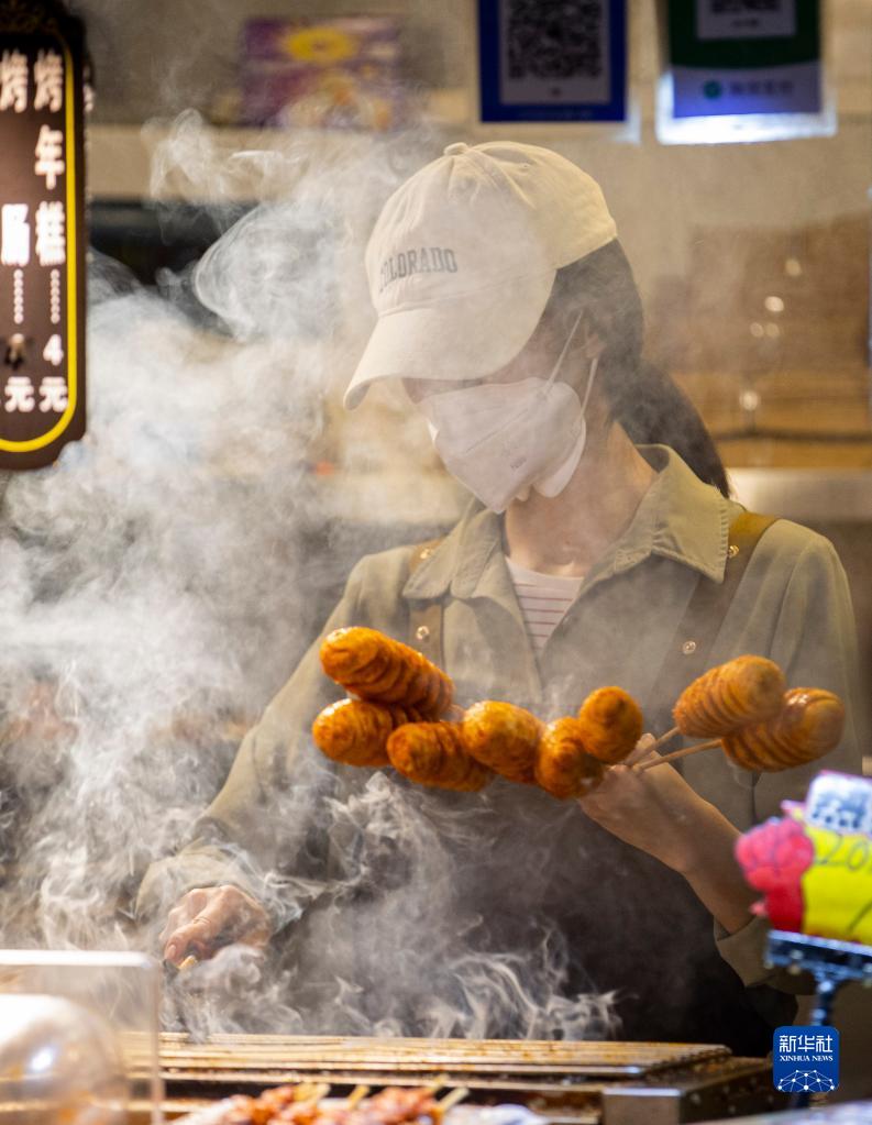5月2日,商戶(hù)在寧夏銀川市金鳳區閱彩城中街制作特色美食。