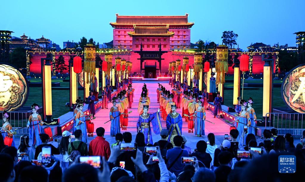 4月30日,游客在西安城墻景區觀(guān)看演出《夢(mèng)長(cháng)安——大唐迎賓盛禮》。