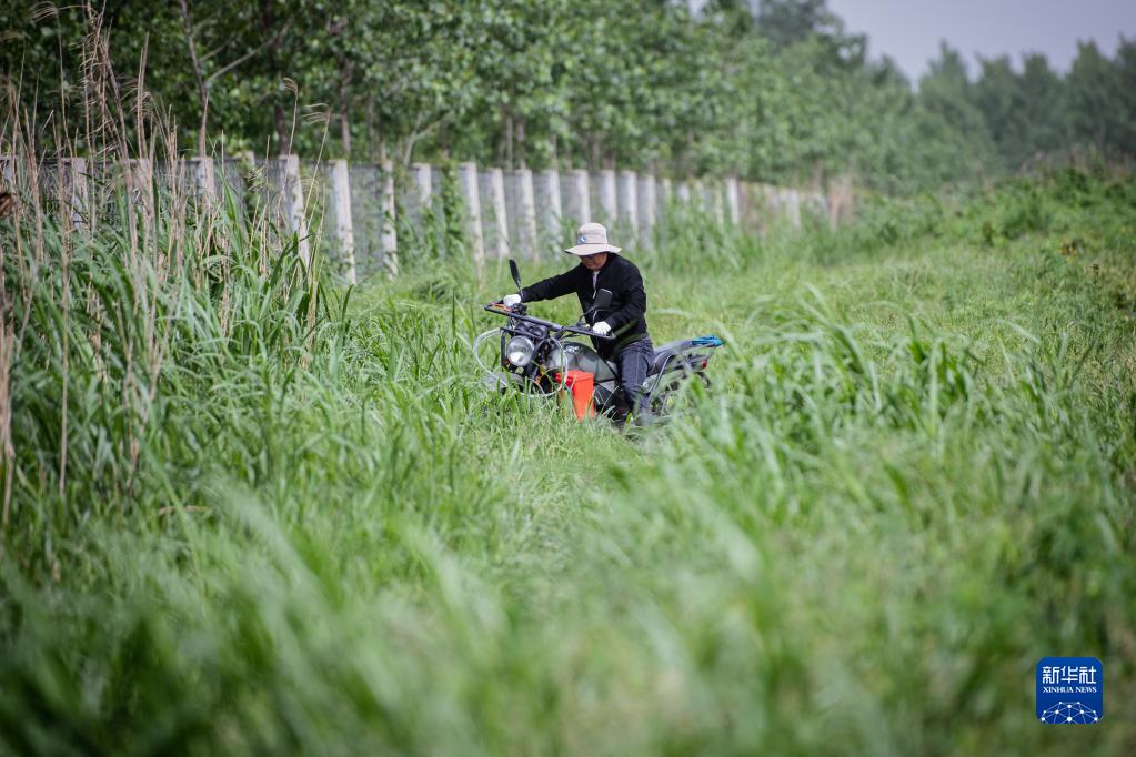 4月29日,在石首麋鹿國家級自然保護區,巡護員王傳軍騎車(chē)在齊腰高的野草中巡邏。
