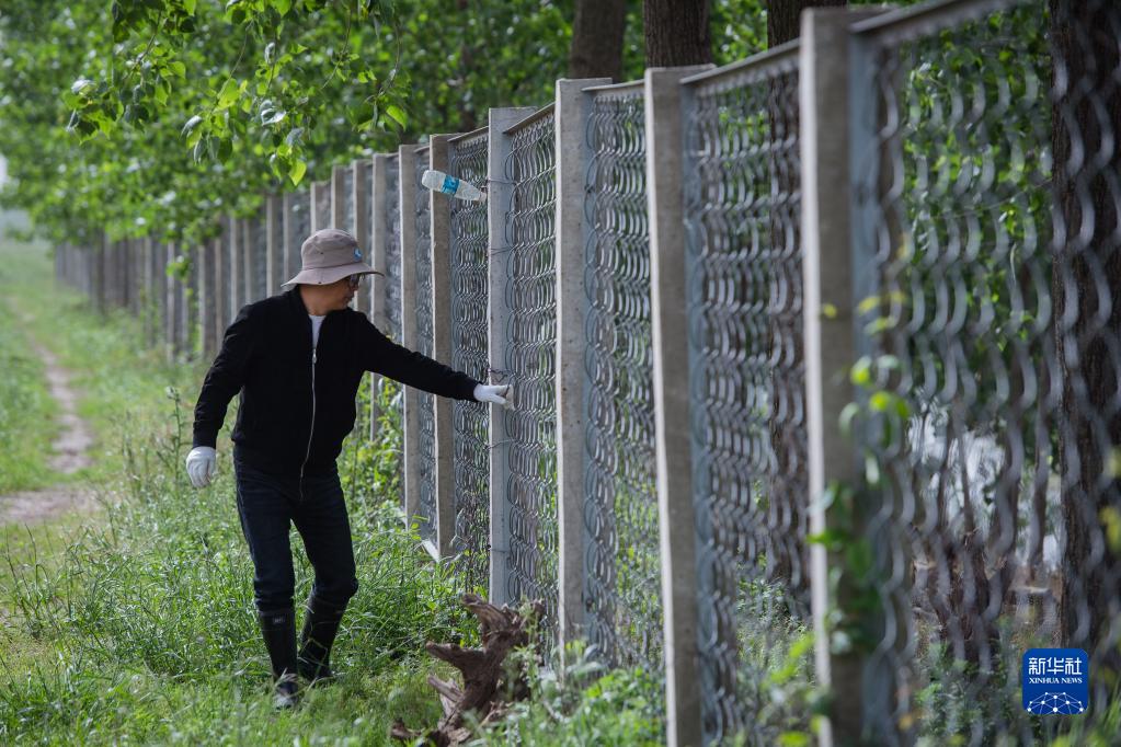 4月29日,巡護員王傳軍在石首麋鹿國家級自然保護區檢查鐵絲網(wǎng)。