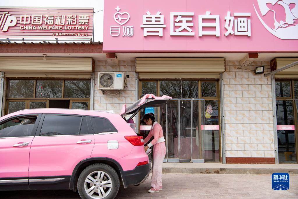 白婳在位于寧夏固原市原州區中河鄉的鄉村獸醫服務(wù)站前整理車(chē)內藥品(4月18日攝)。