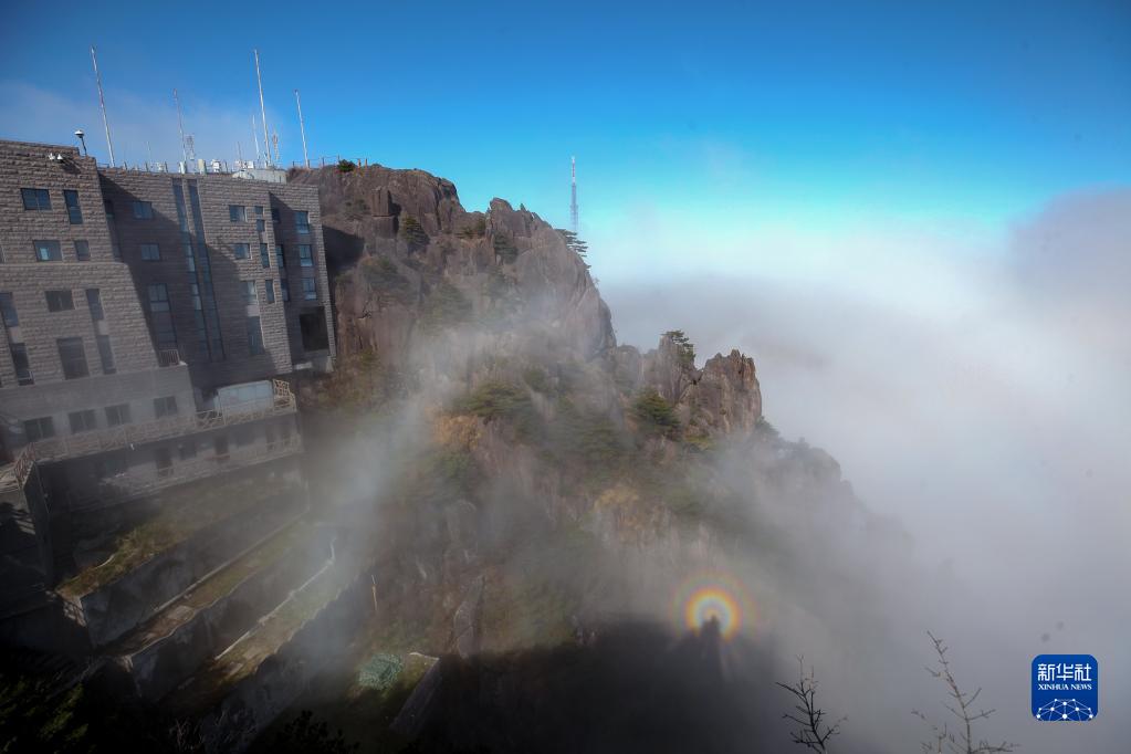2022年11月23日,連續降雨過(guò)后,天空放晴,云海翻動(dòng),黃山光明頂出現“佛光”景象。