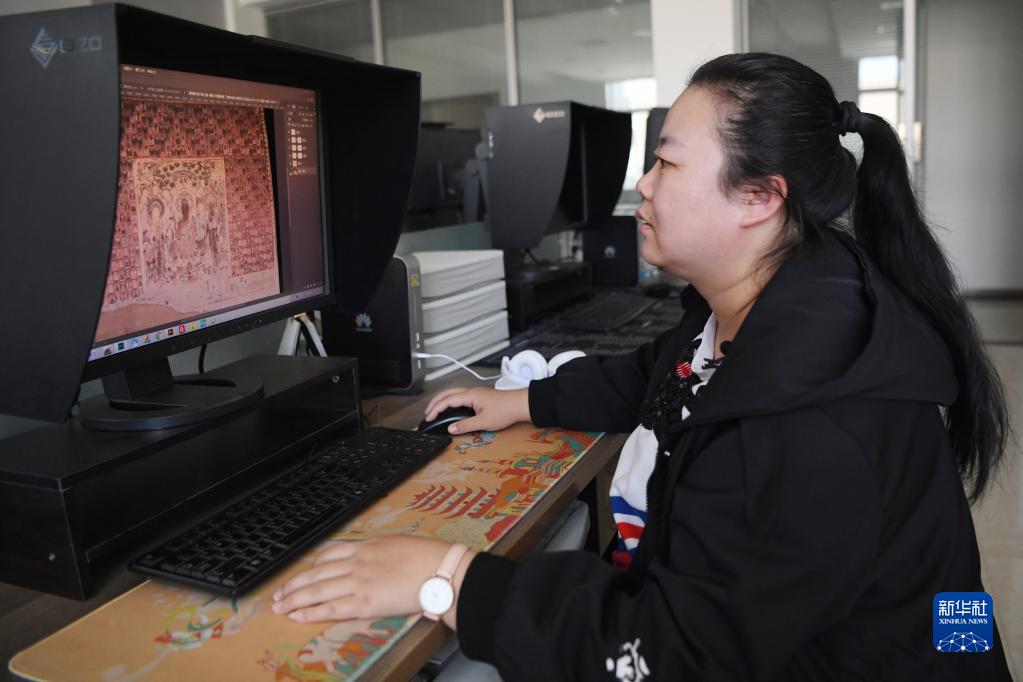 敦煌研究院文物數字化保護團隊圖像處理人員年海麗在拼接壁畫(huà)圖像(4月25日攝)。