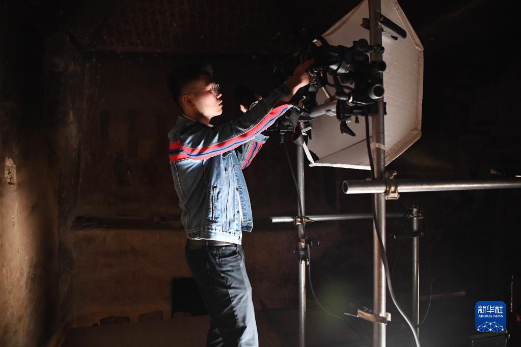 敦煌研究院文物數字化保護團隊圖像采集人員熊業(yè)騰在洞窟內調試設備,準備進(jìn)行壁畫(huà)圖像采集(4月25日攝)。