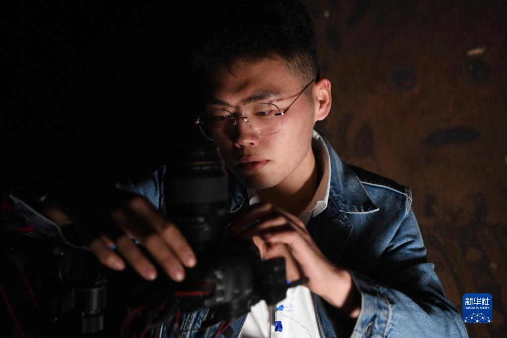 敦煌研究院文物數字化保護團隊圖像采集人員熊業(yè)騰在洞窟內調試設備,準備進(jìn)行壁畫(huà)圖像采集(4月25日攝)。