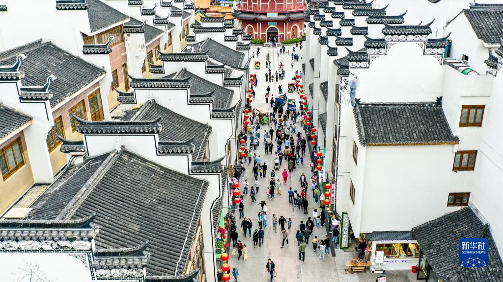 5月3日,游客在浙江省湖州市長(cháng)興縣龍之夢(mèng)太湖古鎮景區游玩(無(wú)人機照片)。