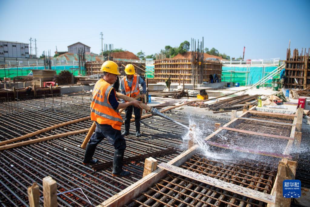 5月3日,在長(cháng)沙西站建設工地,工人做混凝土澆筑前準備。