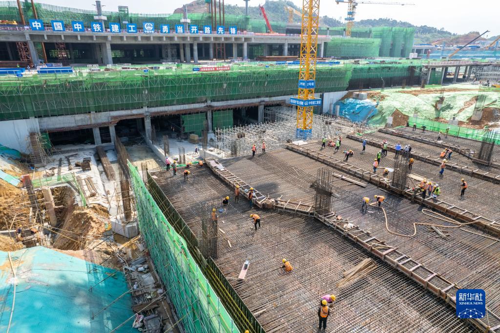 5月3日,在長(cháng)沙西站建設工地,工人做混凝土澆筑前準備(無(wú)人機照片)。