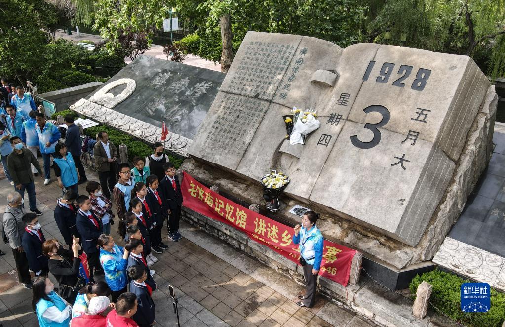 5月3日,志愿者在“五三慘案”紀念碑前為市民講述歷史(無(wú)人機照片)。