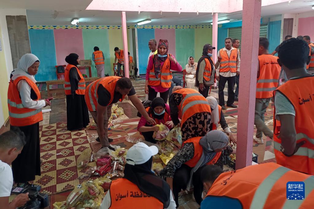 5月2日,在埃及南部阿斯旺省,工作人員為逃離蘇丹進(jìn)入埃及的難民準備救濟包裹(手機拍攝)。