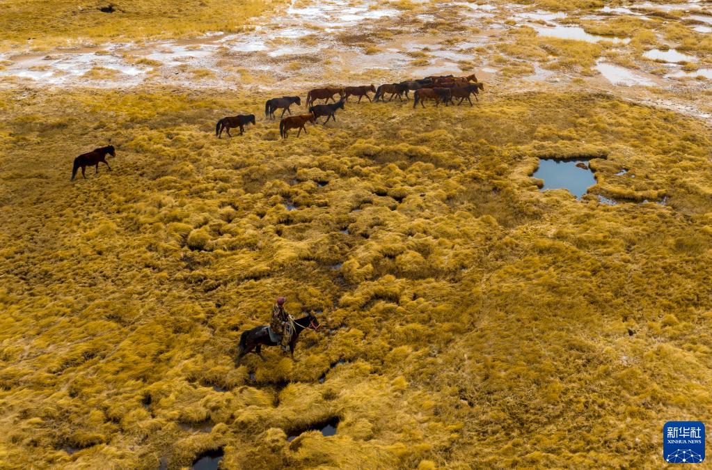 5月3日,在阿克塞縣阿伊納鄉海子草原,牧民趕著(zhù)馬群進(jìn)行轉場(chǎng)(無(wú)人機照片)。