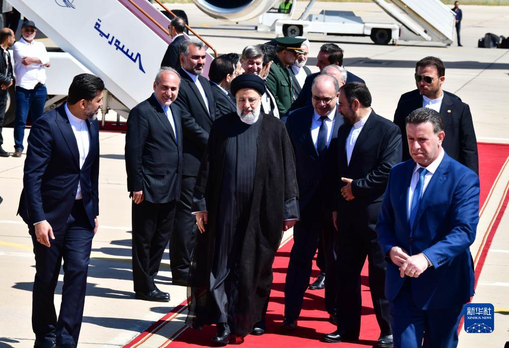 5月3日,伊朗總統易卜拉欣·萊希(中)抵達敘利亞大馬士革國際機場(chǎng)。
