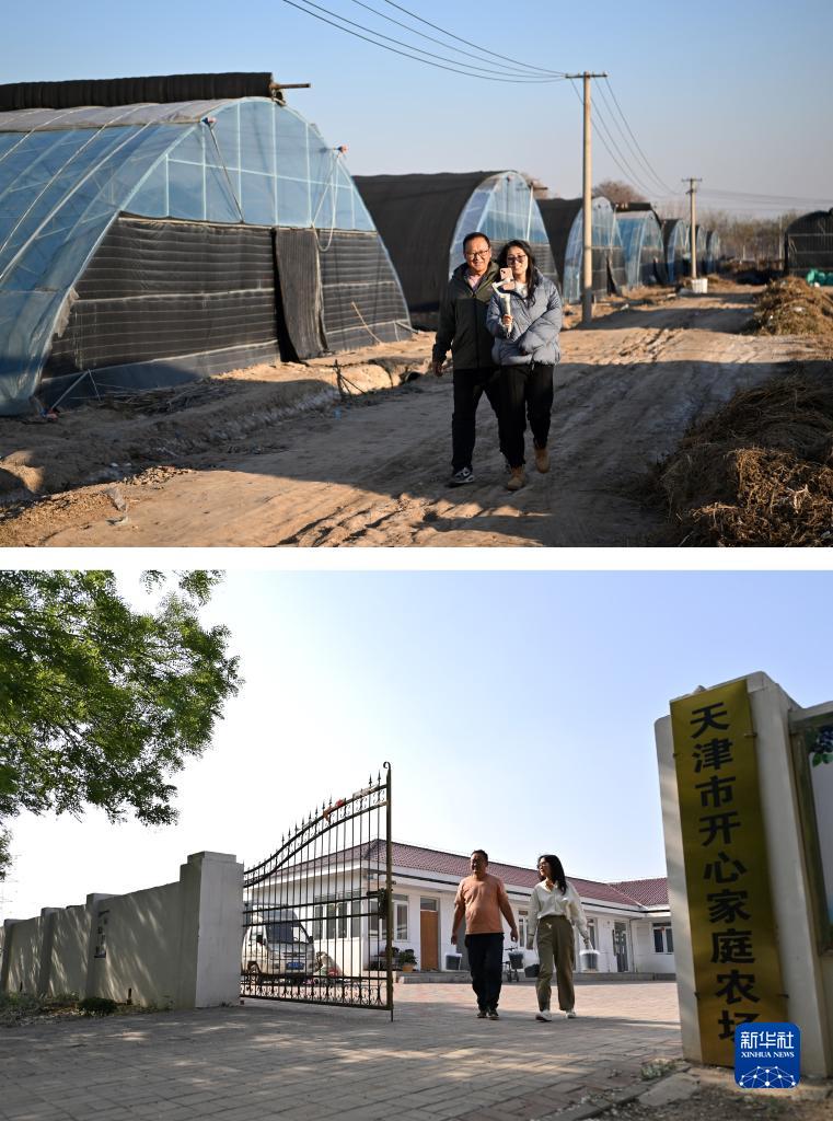 拼版照片:上圖為呂欣和丈夫馮愛(ài)喜通過(guò)直播介紹自家種植藍莓的大棚(2022年12月6日攝);下圖為呂欣和丈夫馮愛(ài)喜一起走出家庭農場(chǎng)(5月3日攝)。