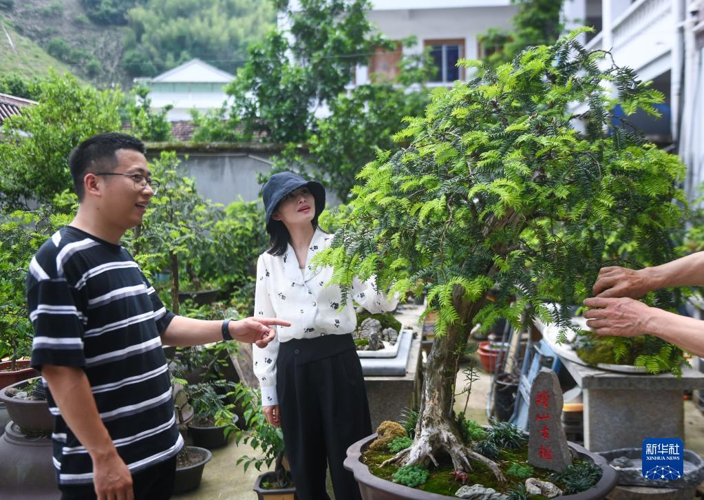 5月4日,90后青創(chuàng )客金志鵬(左)在香榧盆景園中給游客介紹不同造型的香榧盆景。