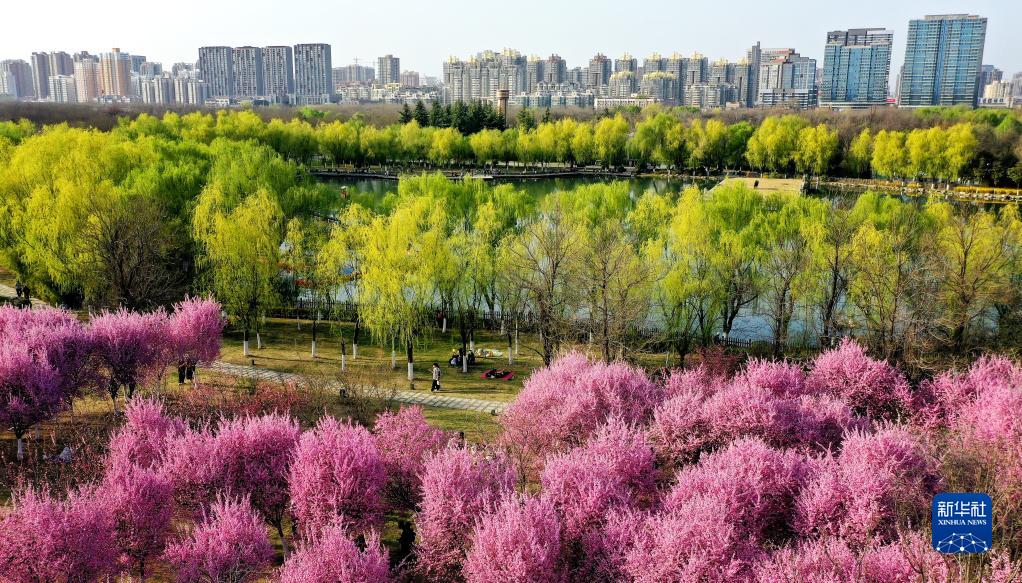 西安大明宮國家遺址公園內的美人梅連片盛開(kāi)(3月14日攝,無(wú)人機照片)。