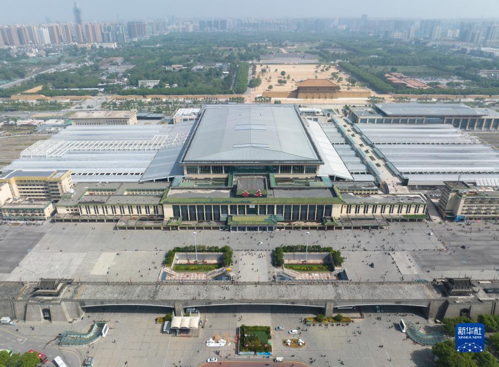 西安火車(chē)站與其身后的大明宮國家遺址公園(4月25日攝,無(wú)人機照片)。