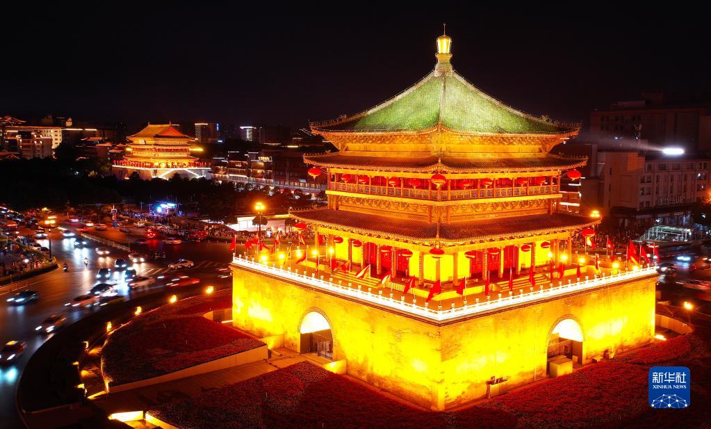 西安鐘樓夜景(5月2日攝,無(wú)人機照片)。