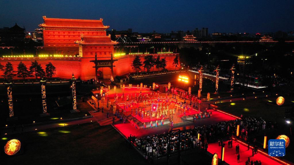 游客在西安城墻永寧門(mén)觀(guān)看《夢(mèng)長(cháng)安——大唐迎賓盛禮》(4月30日攝,無(wú)人機照片)。