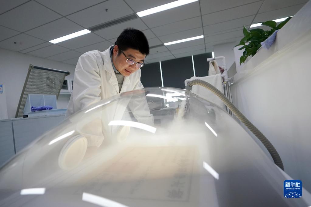 4月28日,在上海市檔案館的保護技術(shù)部,檔案修復師任翹楚利用專(zhuān)業(yè)設備對檔案進(jìn)行展平處理。
